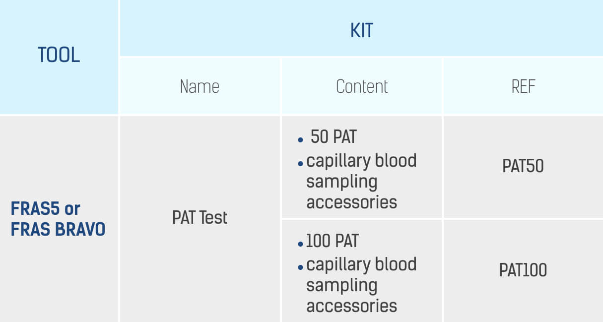 The PAT test is a photometric test that can be used in outpatient, research and pharmacy settings on a dedicated system (FRAS 5 or FRAS BRAVO) or in any laboratory equipped with a photometer.